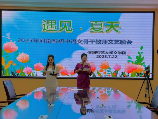 2025722日晚,“省培计划(2025”初中语文省级骨干教师培育项目文娱晚会于人文楼三楼会议室顺利举行。晚会由文艺委员陈阳与学员冯兰兰共同主持,全体学员齐聚一堂,共赴这场文艺盛宴。