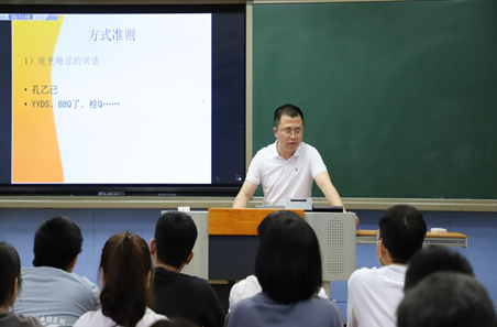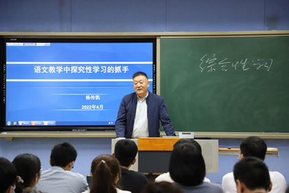 徐洪军从《<爱是不能忘记的>身体美学分析》中乔林的身体入手,引出本节课的重点“寻找男子汉”,接着利用冬奥开幕式引出背后的男子汉张艺谋,融时政于课堂,最后用习近平的话“实干兴邦,空谈误国”告诫青年。课堂十分活跃。方志红《人物通讯的选题和标题》通过人物选择以及标题的制作,使人物通讯可以发掘我们身边人物的真、善、美。杨传凯的《语文教学中探究性学习的抓手》从教学理论的变迁切入,重点讲解了语文课堂要从不同的角度切入、要从学生感兴趣的角度切入、要从文章的重点疑点切入,语文课堂要注重过程和探究。陈星宇《和而不同,美美与共:莫言小说与中国文学的审美精神》,从“美的讲述”与中国故事、“美的标准”与中国审美、“美的精神”与中国精神三个方面阐述了以莫言小说为代表的中国文学审美精神。毕晋的《语言与交际》从数量准则、质量准则、关联准则和方式准则,以及礼貌语言的使用几个方面讲解了言语交际时应遵循的准则规范。于德辉《古代汉语词汇与优秀传统文化》,以信阳师范学院的校训“厚德崇实 善学敏行”为例,讲解了古代汉语词汇背后蕴含的深厚传统文化。