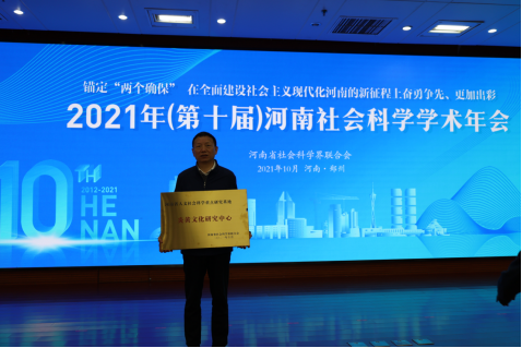 10月12日上午,由河南省社会科学界联合会主办的2021年(第十届)河南社会科学学术年会主会场活动在郑州举行。会议以“锚定‘两个确保’,在全面建设社会主义现代化河南的新征程上奋勇争先、更加出彩”为主题,并公布了2021年度河南省人文社会科学重点研究基地名单,举行了授牌仪式。由我校校长、炎黄学研究院执行院长李俊教授主持申报的炎黄文化研究中心,在此次年会上获批为2021年度河南省人文社会科学重点研究基地,为我校炎黄学研究又增添了一个新的科研平台。