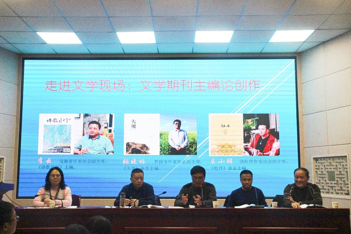 11月30日-12月1日*成人动漫 邀请安徽省作协副主席、《诗歌月刊》主编李云,开封市作家协会副主席、《大观》杂志主编张晓林,洛阳市作家协会副主席、《牡丹》杂志主编王小朋等知名刊物主编为成人动漫 研究生带来诗歌创作和诗学研究方面的指导。此次“走进文学现场”活动,提高了同学们对于文学的兴趣,激发了同学们写作的热情和信心,有利于学生文学素养的提高和精神文化世界的丰富。