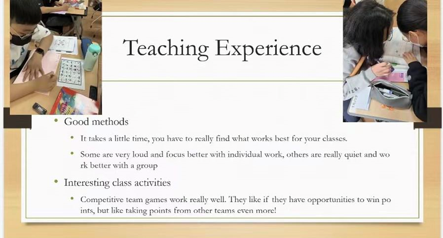 Mallory首先向同学们分享了教学经验,她认为对外汉语课堂应该用多样化的教学方法来吸引学生的学习兴趣,从而提高学生学习的主观能动性。针对如何增强汉语学习者线上学习兴趣这一问题,她认为有趣的视频和简单的中文歌曲能够激发学生学习汉语的主动性和积极性。接着,Mallory以自身的实际经历为例,讲述了不同文化差异的相关问题,使同学们充分认识到跨文化交际的重要性。最后,Mallory分享了自己的生活经历。除了工作之外,Mallory非常热爱生活,曾经旅游过18个国家。她认为人生的意义在于不断地经历和探索未知的生活,在曼妙的风景中认识自我价值。