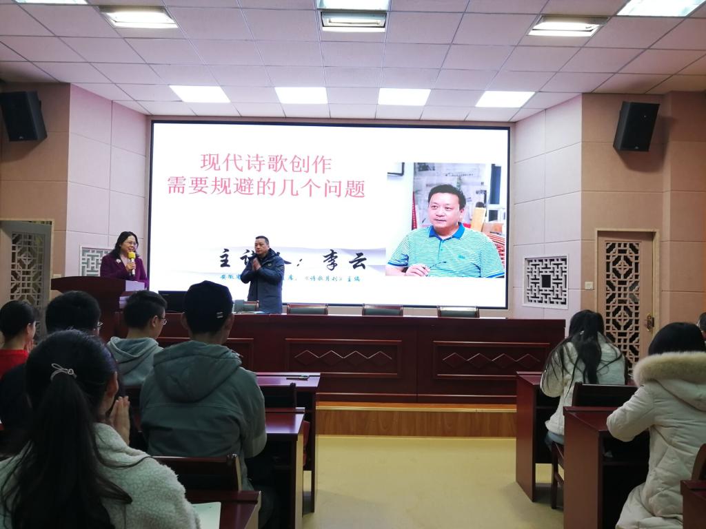 李云老师从诗的定义、特征和要素等角度详细阐明了诗歌是什么的问题。李云老师从个人对诗歌是什么的理解出发,条理清晰的指出:“诗是主情的文学体裁,它是以抒情方式,审视并反映现代人对社会生活本质特征、存在价值和情感内部的瞬间感觉,是具有音乐美的分行文字。”此外,针对现代诗的创作问题,李云老师着重强调诗歌创作者要具有一定的情怀,要有高度的社会责任感和敏锐的社会洞察力,要写出有深度,有温度,有灵气的优秀诗歌作品。李云老师还从诗歌创作中的视角转换、创作现代诗歌的准则意识、诗歌创作的技法等方面给予了同学们宝贵经验。