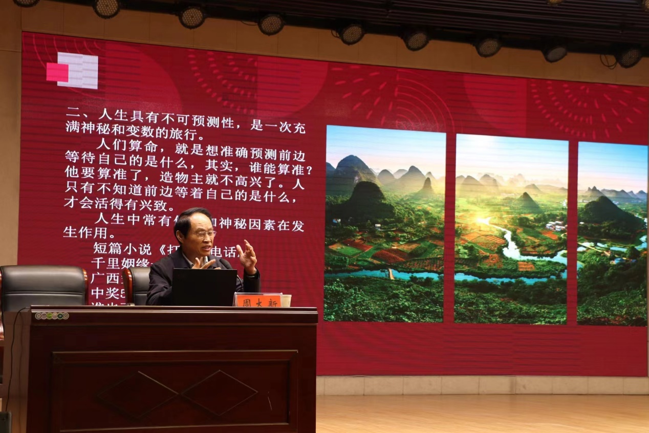 作家周大新以古今中外的文学作品为基础,从人生具有不可返性、不可预测性、不可比性,又具有规律性、趋利性、寂灭性、可悟性等7个方面,概括文学创作所摹写的个人存在现实,阐释“文学和人生像鱼和水一样密切相连”,而“人生最忌是得意”。在互动环节,同学们就写作、读书、人生等方面的问题踊跃发言、积极提问,周大新耐心地一一解答,并与同学们分享自己的生活经历、生命体验和创作经验,现场气氛十分热烈。