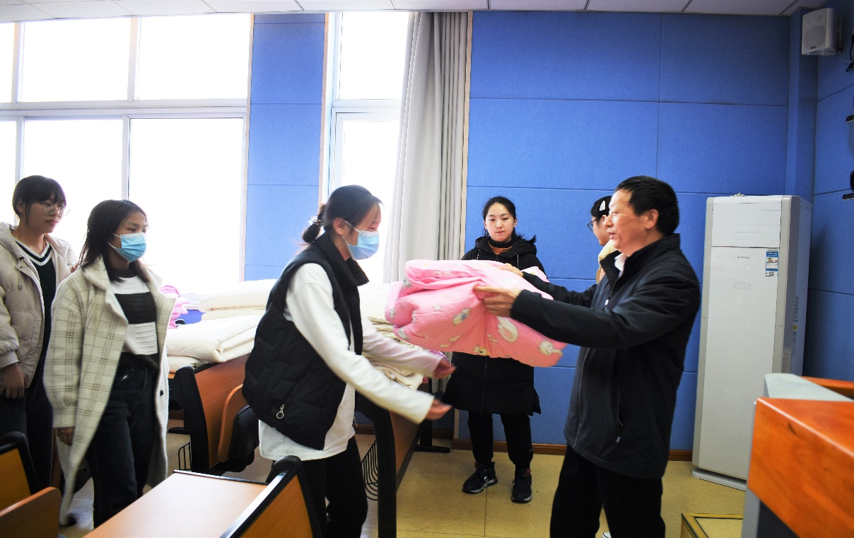 仪式开始,王振海书记和姚圣良院长亲手为同学们发放棉被,并与同学们进行亲切交谈,表示棉被都足够厚实,希望同学们可以感受到学校对他们的关怀,从中获得温暖,嘱咐同学们在平时要做好保暖措施,注意身体健康。王振海书记发表讲话,从学会感恩、认真学习和积极为社会做贡献三个方面对同学们提出不同要求,希望同学们在感受到温暖的同时懂得感恩国家和感恩社会,牢记自己的学习本分,为社会做出贡献,积极努力回报社会。参与同学认真聆听书记教导,将嘱托记在心中。