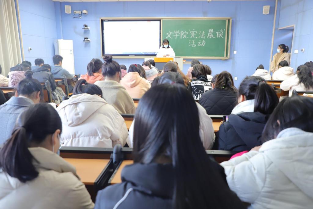 12月3日上午,为迎接第八个国家宪法日(12月4日),配合2021年全国教育系统“宪法晨读”活动,*成人动漫 于人文楼407教室举行“宪法晨读”活动。本次活动由*成人动漫 劳纪部组织,辅导员、班主任以及学生代表参与此次活动,其他师生通过其他形式积极观看直播活动。