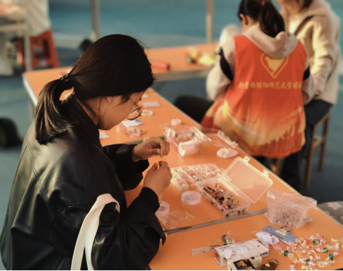活动精心设置“成品交换区”与“创意工坊”两大核心区域,为学子们打造多元互动空间。成品交换区内,闲置书籍、实用文具、特色文创等物品整齐陈列,同学们以物易物,让闲置资源焕发新价值,换得心仪的手工编织手链;创意工坊里,丰富的编织材料包悉数备好,大家专注穿绳、巧手编织,将心意融入每一款独特手链。这些精巧的手作不仅是视觉的点缀,更成为跨越陌生的情感纽带。
