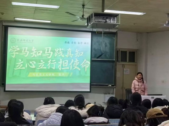 会上,三位来自不同学院的宣讲团成员依次登台,结合自身成长经历,从思想淬炼、学业深耕、实践赋能等多个维度,分享了自己的奋斗历程与成长感悟,生动展现了新时代师大学子的责任与担当。其中,教育科学学院的王梦丹同学重点分享了自己的实践经历,她走进中小学课堂开展助教工作、深入社区开展志愿服务、走进红色场馆参与讲解引导,将专业知识与社会需求紧密结合,用实际行动诠释初心不改的青春诺言,她真诚地说道:“榜样从不是天生的,而是在日复一日的坚持与付出中慢慢长成的。”旅游学院的吴思妤同学以“等枝桠成繁花”为主题,讲述了自己的成长故事,她在思想上积极向党组织靠拢,主动牵头并参与多项红色文化宣传活动,凭借扎实的工作表现荣获“优秀工作者”“先进个人”等荣誉称号;在实践中,她主动担当学生工作,热心服务同学,在多元锻炼中不断突破自我,她坚信:“春天播下的努力种子,经过夏天的蓄力沉淀,终会迎来繁花绽放的时刻。”马克思主义学院的张卓同学则聚焦基层志愿服务经历,分享了自己在琵琶山小学、飨堂小学开展大别山精神、雷锋精神宣讲的点滴,以及在何家冲深入群众,开展关爱留守儿童、慰问独居老人等暖心服务的故事,她用实际行动践行“学马知马践真知,立心立行担使命”的主题,让在场同学深刻感受到青年担当的重量。
