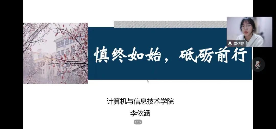 首先,柳老师和郑老师对宣讲团成员进行了介绍,并对他们的到来表示感谢。随后,三名优秀学子从思想、生活、学习、工作等各个方面依次为同学们分享了自己在大学期间的成长经历、奋斗历程与收获感悟,向我们展现了属于他们的青春风采。李依涵同学建议大家去尽可能的尝试更多感兴趣的东西,校级组织、感兴趣的选修课、竞赛小组、科研项目、社会实践等,每一段经历都会带给你一些不一样的感悟,成为非常宝贵的回忆,希望同学们能够参与将自己的大学生活过的多姿多彩,做好规划,在相应的时间做想做的事情,去认识更多不一样的人,看不一样的风景,经历一段故事,成就一段回忆。孙晗同学提出要制定具体的学习计划,循序渐进、脚踏实地、持之以恒地去做,要掌握搜集、整理材料的技巧,学习主要是靠自觉,除了掌握老师课堂上讲的内容,还要利用课余时间阅读其他相关的书,查找资料,在提高自己专业知识的基础上,有目的地丰富各方面的知识。郭振宽同学告诉同学们在学习与工作中,尽量做到慎独自律,以一个尽量高的标准去要求自己,定一个自己得努下力才能实现的目标,用它去鞭策一下自己。只要能进步,遇到的挫折多些、磨炼多些、付出多些、社会毒打多些,都是可以理解的。只要阅历能再丰富些,生活能再充实些,学术能再精进些,中间的过程再曲折离奇也是可以接受的。最后,柳老师和郑老师对本次活动进行了总结,呼吁青年大学生们应该积极向身边的榜样学习,保持一颗积极上进的心,心存理想,迎难而上,不辜负时间的馈赠,努力成为更优秀的自己,书写属于自己的精彩人生篇章。宣讲者们的精彩演讲赢得了同学们的阵阵点赞和讨论,纷纷表示受益匪浅。