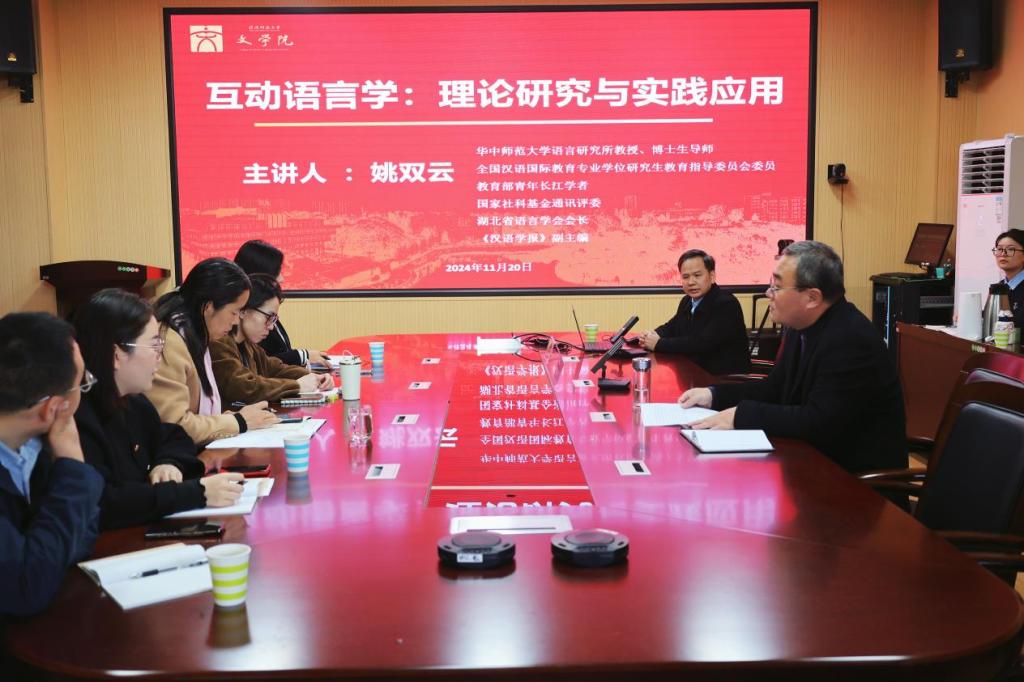 11月20日上午,华中师范大学语言研究所教授、博士生导师、教育部青年长江学者、湖北省语言学会会长、《汉语学报》副主编姚双云教授在人文楼三楼会议室,为成人动漫 师生作了题为《互动语言学:理论研究与实践应用》的学术讲座。讲座由副院长张言军主持,*成人动漫 部分教师及2024级全体研究生聆听了报告。
