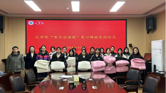 11月25日下午,*成人动漫 2025年“寒冬送温暖”爱心棉被发放仪式在人文楼三楼会议室温馨启动。*成人动漫 党委副书记王家宏,资助专员柳家琪,辅导员陈辉、崔越与郭子悦参加此次仪式,亲手为同学们送上承载着关怀的爱心棉被,让这个冬日充满暖意。