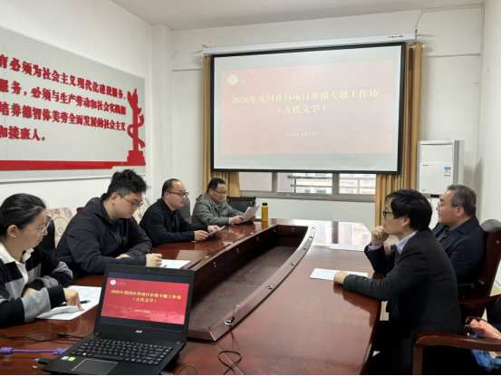 4月7日下午,为推进国社科项目申报工作,2026年度国社科项目申报专题工作坊(古代文学)第三轮论证会在人文楼4-5会议室举行。本次会议特邀张言军教授莅临指导,古代文学教研室部分青年教师参与研讨,论证会由工作坊召集人许中荣主持。