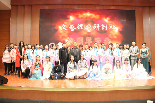 晚会伊始,吴书记上台发表致辞,他表示祝贺文艺经典研讨社成立十周年,并谈到文艺经典是中国优秀的传统文化,需要我们当代大学生尤其是文学专业的学生重视它、继承并发展它。晚会节目在优美曼妙的汉服走秀中缓缓拉开序幕,随后,同学们透过歌舞、小品、诗歌朗诵等形式多样的节目,将晚会推向高潮。一支轻盈的古典舞为观众呈现出古典文化的神韵和与魅力。武术健美操的表演完美诠释了中国武术的柔美与刚强之力。小品《面试》通过讲述店长对面试者的“小偷”身份的一系列误会,向观众揭示出不应以貌取人、妄加猜测的道理。最终,晚会在意蕴悠长的诗歌朗诵中圆满结束。
