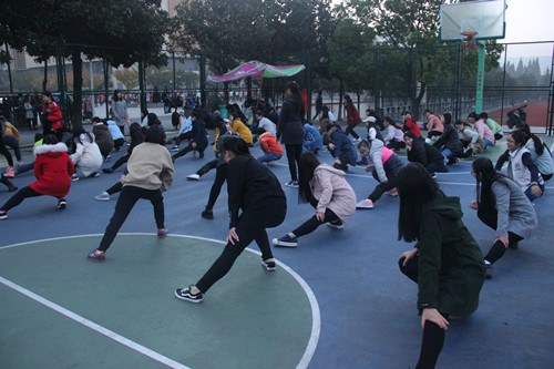 16级各班早早地便来到场地,集合完毕后,各班班长及体育委员带领大家开始了热身活动。活动形式种类繁多,有伸展运动、压腿运动、小组活动、健美操等。其中,汉语言文学三班在进行分步骤的健身运动,伸展、按压、前屈,姿势标准,动作整齐划一。汉语言文学四班的同学加强练习广播体操的动作,力求每个动作做得到位标准。汉语国际教育班则在负责人的带领下认真的复习体育课上所学十二步,每位同学都精神饱满,活力十足。