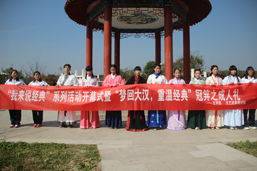 (本网讯 马静静武祖坤)为了让更多人了解中国的传统礼仪,弘扬辉煌灿烂的民族文化精华,培养当代大学生心怀感恩,胸怀天下,勇于奉献,珍惜友谊的优秀品格,10月17日下午*成人动漫 文艺经典研讨社在文心亭举办“梦回大汉,重温经典—冠笄之成人礼”活动。