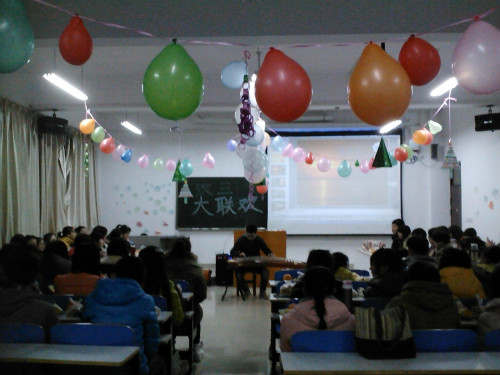 (本网讯 王曼)12月22日晚,2011级汉语言文学三班在逸夫楼103举办了一场圣诞狂欢节晚会,该班班主任杜昆、任课老师杨文臣应邀参加了此次晚会,和该班全体同学欢聚一堂,共度良宵。