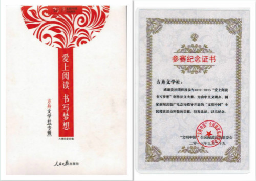 近日,我校*成人动漫 方舟文学社收到了由“文明中国”全国阅读活动组委会发来的《爱上阅读、书写梦想——方舟文学社专辑》一书以及该组织颁发的参赛纪念证书。该书由人民日报出版社结集出版,收录了*成人动漫 方舟文学社社员创作的包含诗歌、散文、小说等体裁在内的152篇优秀作品。