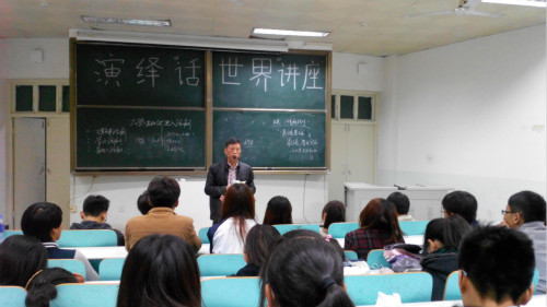 王雨海教授将个人之于话剧世界分为三个层次:理解话剧、学习话剧、融入话剧。他从话剧的起源地古希腊讲起,详解了从希腊神话中的酒神狄奥尼索斯,到莎士比亚,再到易卜生等人对中国近现代戏剧的重大影响。在此基础上,王教授进一步从形式、内容、发展等方面对中西话剧进行了比照,为现场同学呈现了广阔深厚的的话剧演变历史。同时,他建议同学们平时多读《戏剧技巧》、《斯坦尼•斯塔夫斯基文集》、《焦菊隐文集》等经典作品,以此来切实提高自身体悟及表演话剧的能力。在融入话剧方面,他认为话剧是对人生重大意义和奥秘的探索,要融入话剧,就要把话剧与人生联系起来,体会话剧与人生互有裨益的关系。“人生如戏,我们都要去演好自己的角色,才能成功。”王教授如是说。王雨海,教授,信阳师院校级重点学科现当代文学学科带头人。长期从事该校晨曦话剧社话剧排演指导工作,在其指导下公演的经典剧目《日出》、《原野》《家》等,对人性及情感进行了深刻的探讨,并为师院学生带来深层次的反思,产生了巨大校园影响力。(编辑 辛甜甜 高笑蕊)