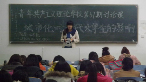 (本网讯 宋艳如)11月5日,*成人动漫 组织的青年共产主义理论学校第57期讨论课在人文楼206教室成功举行。本次讨论课以城市化对当代大学生的影响为主题。