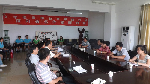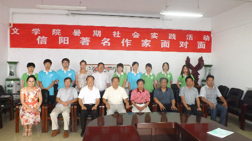 7月8日下午,中国作家协会会员、信阳文学界知名人士赵主明、陈有才、陈峻峰、田君、陈宏伟等一行五人,来到信阳师院*成人动漫 ,在该院3-11室与该院参加暑期社会实践的同学们围绕信阳本土文学与中原文化发展等相关话题,探讨文学发展历程,共同感受文学魅力。*成人动漫 党总支书记、院长吴圣刚、副院长沈文慧、党总支副书记白献林等领导老师参加了这次“走进信阳著名作家”暑期社会实践活动。