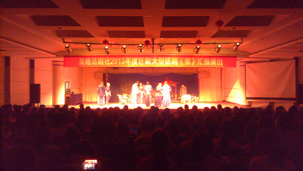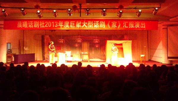 (本网讯 王曼)5月15日晚7点,理科楼报告厅内座无虚席。经过两个多月的精心排练,*成人动漫 晨曦话剧社2013年年度汇报演出曹禺话剧《家》隆重开幕。*成人动漫 党总支书记、院长吴圣刚,校党委宣传部副部长刘党英,外语系党总支副书记陈铭,党总支副书记白献林,晨曦指导老师王雨海教授,团总支书记冯正强与近700名师生一起观看了本次演出。