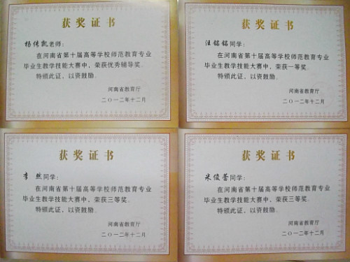 另悉,在河南省第十届高等学校师范教育专业毕业生教学技能大赛中,成人动漫 学子也取得了突出的成绩,其中2009级汉语言文学三班汪铭铭同学获大赛一等奖,李然、米俊蕾两位同学获三等奖,杨传凯老师获大赛优秀辅导奖。