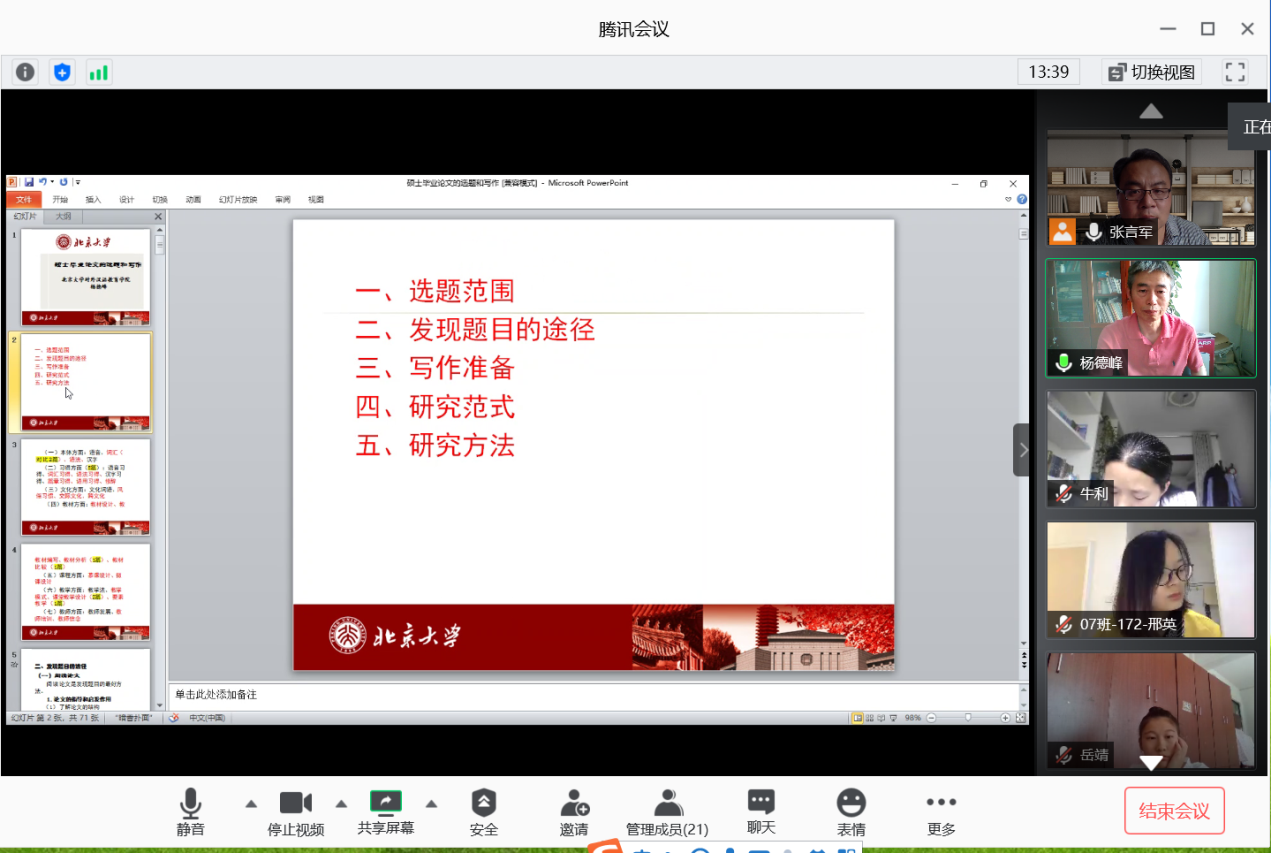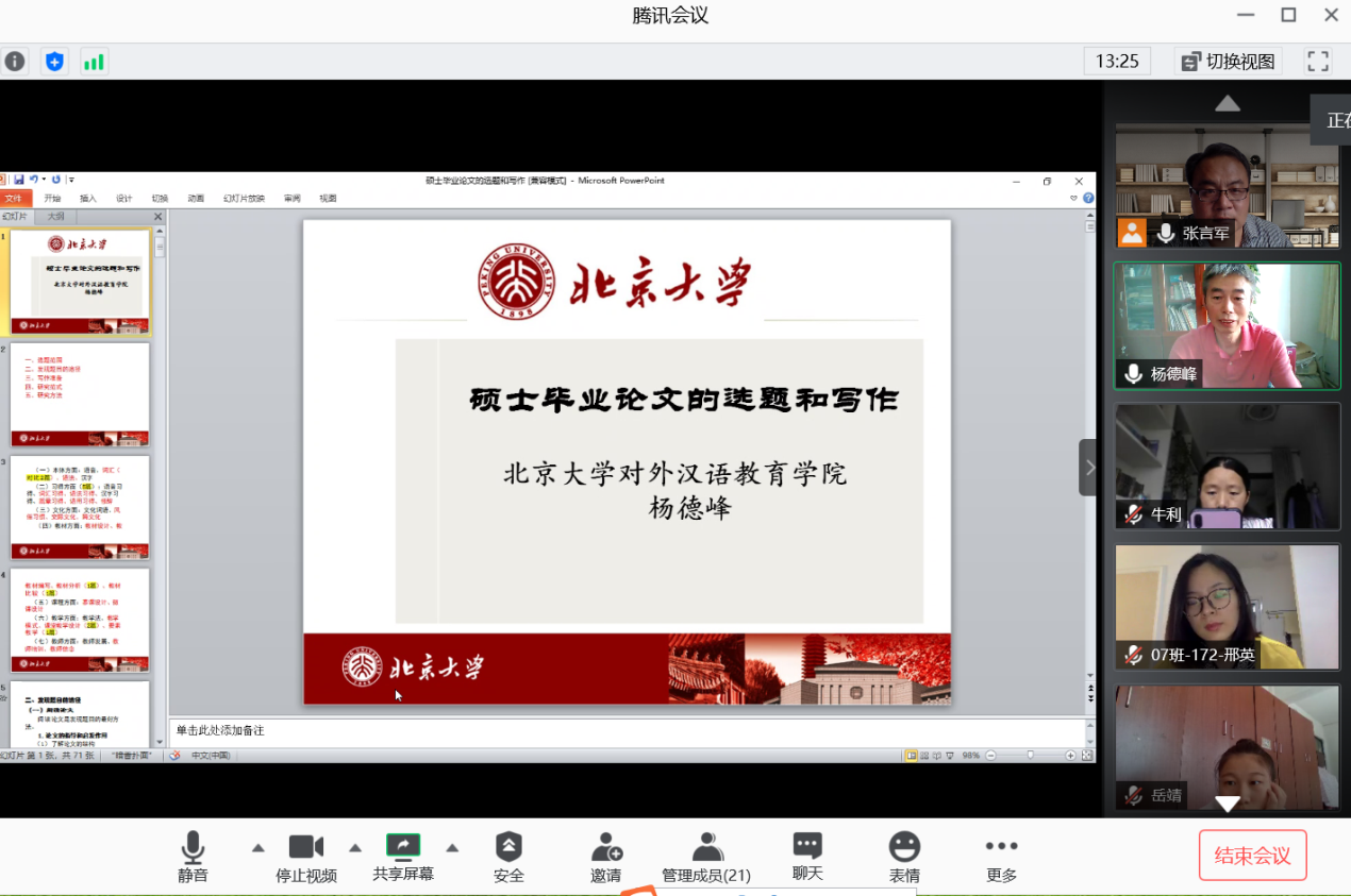 6月10日下午,应*成人动漫 和汉语国际教育研究所邀请,北京大学对外汉语教育学院博士生导师杨德峰教授,在网络平台腾讯会议作了题为“汉语国际教育专业硕士毕业论文的选题和写作”的学术报告。报告由*成人动漫 副院长张言军主持。*成人动漫 全体汉语国际教育专业学位硕士研究生及研究生导师共同聆听了讲座。