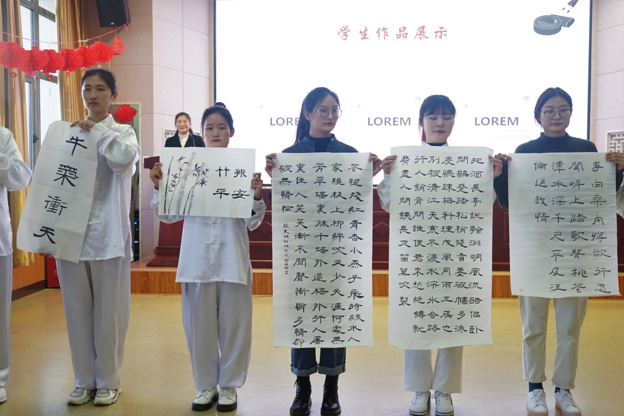 第二个节目为优秀书画作品展示,同学们不仅展示了隶书、楷书等书法作品,还展示了牡丹、紫藤等工笔画。