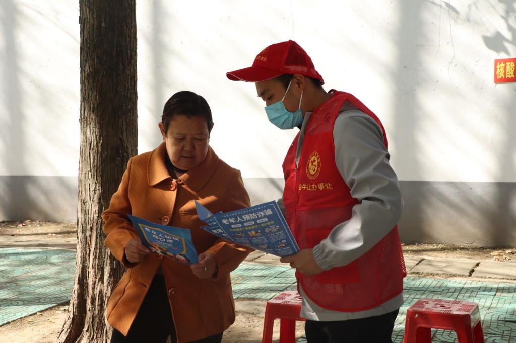在本次活动中陈辉老师和郭子悦老师深入群众活动中心等人员密集的区域,发放防范诈骗宣传单,重点对文化程度较低、年龄较大等易受骗重点人群宣传,并耐心为辖区群众讲解新型电信诈骗案例,引导群众更好的掌握防范电信诈骗的基础知识。