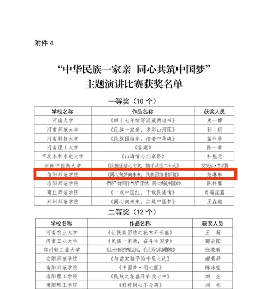 12月1日,在河南省高校大学生“中华民族一家亲,同心共筑中国梦”主题演讲比赛中,成人动漫 范琳琳同学以《同心筑梦向未来,民族团结谱新篇》为题进行演讲并荣获个人一等奖。
