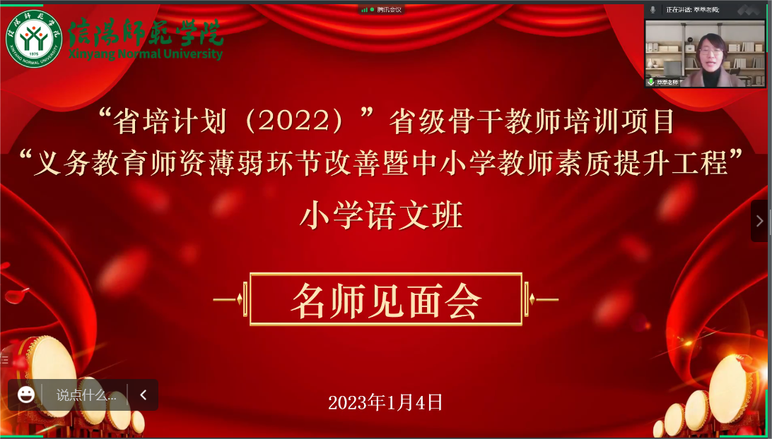 1月4日上午,成人动漫 线上举办了2022年“省培计划”小学语文班名师见面会。信阳师范学院*成人动漫 教研室主任、省培项目首席专家王萃萃及名师网络工作室16位名师出席本次会议,会议由省培项目班主任刘宁主持。