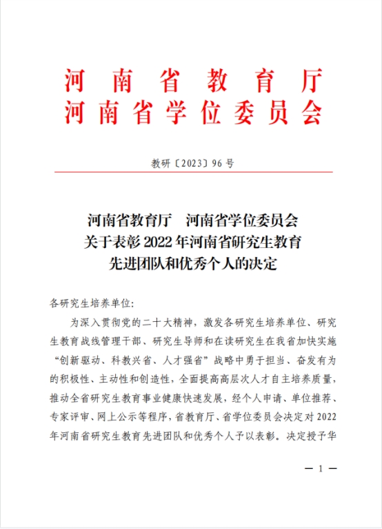 近日,河南省教育厅、河南省学位委员会公布了《关于表彰2022年河南省研究生教育先进团队和优秀个人的决定》(教研〔2023〕96号),成人动漫 中国古代文学荣获河南省优秀研究生导师团队,陈晓晖(信阳市羊山中学,校外兼职导师)荣获河南省优秀研究生指导教师,温昕(学科教学语文,指导教师:赵婧)荣获2022年河南省研究生创新之星。