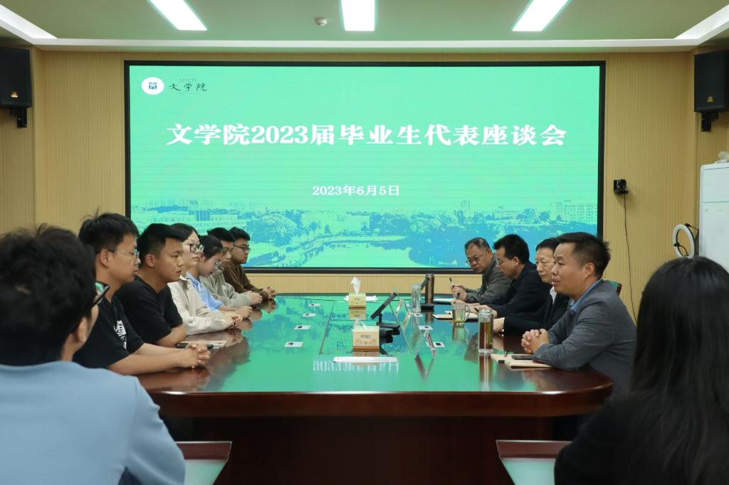 6月5日下午三点半,文院在人文楼307会议室召开2023届毕业生代表座谈会。*成人动漫 党委书记王振海、院长姚圣良、副院长缑广飞、党委副书记王家宏及20名毕业生代表参加会议。座谈会由党委副书记王家宏主持。