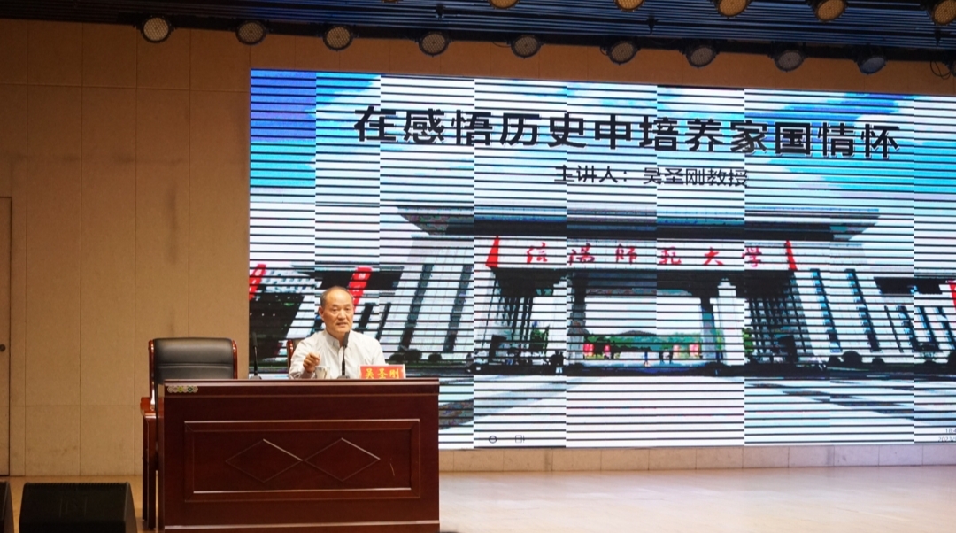 为深入贯彻落实习近平新时代中国特色社会主义思想,帮助新生坚定理想信念、树立远大理想,增强爱党、爱国、爱校情怀,9月23日晚,*成人动漫 在理科楼报告厅开展新生入学教育。离退处吴圣刚教授以《在历史中感悟家国情怀》为主题为2023级新生上了一场生动的思政课。