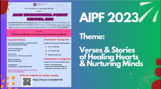 12月15日,由马来西亚玛拉工艺大学主办、多校协办的2023年亚娄国际诗歌节在Webex线上平台如期举行。本次亚娄国际诗歌节的主题为“治愈心灵和培育心灵的诗歌和故事”,要求提交作品必须是未经发表的个人创作,并以朗诵或影片的方式呈现。