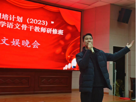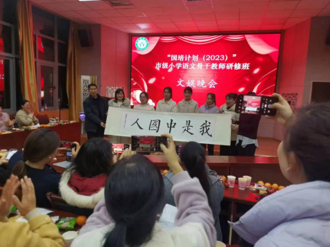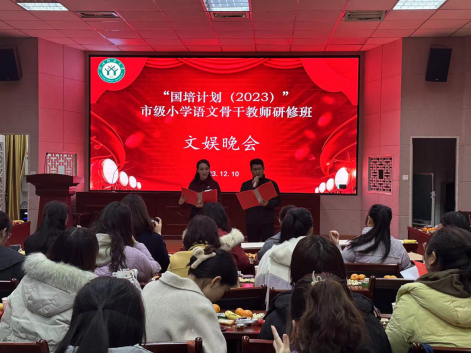 12月10日,“国培计划”市级小学语文骨干教师研修班文娱晚会在综合楼605室顺利举行。晚会由宋艳勤和仓有刚两位老师主持,培训学员、班主任和学生助理共同参与本场晚会。