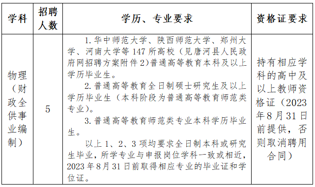 4、《2023年唐河县校园招聘高中(中职)及特殊教育学校急需紧缺教师报名登记表》(见唐河县人民政府网招聘方案附件3);