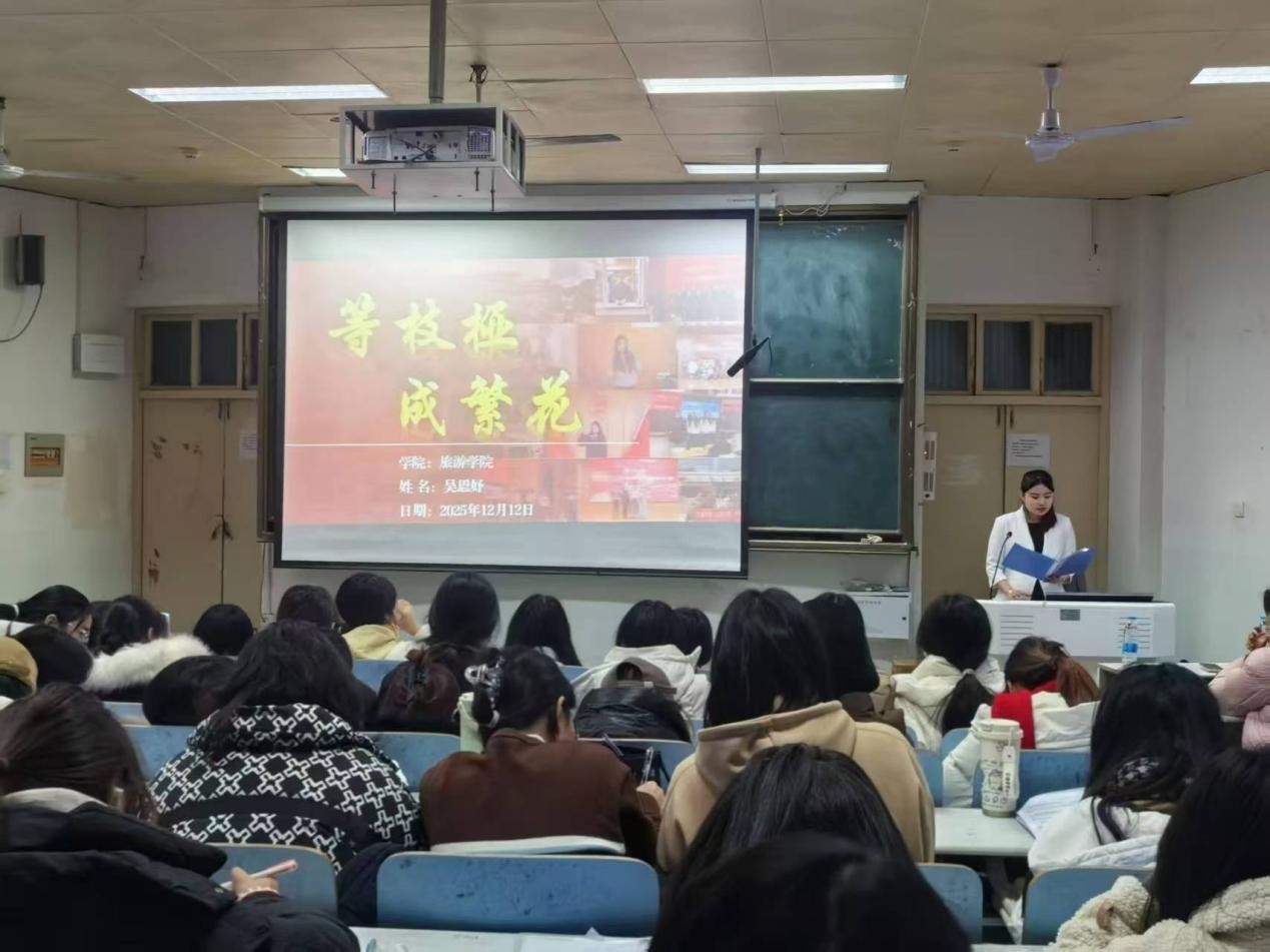 会上,三位来自不同学院的宣讲团成员依次登台,结合自身成长经历,从思想淬炼、学业深耕、实践赋能等多个维度,分享了自己的奋斗历程与成长感悟,生动展现了新时代师大学子的责任与担当。其中,教育科学学院的王梦丹同学重点分享了自己的实践经历,她走进中小学课堂开展助教工作、深入社区开展志愿服务、走进红色场馆参与讲解引导,将专业知识与社会需求紧密结合,用实际行动诠释初心不改的青春诺言,她真诚地说道:“榜样从不是天生的,而是在日复一日的坚持与付出中慢慢长成的。”旅游学院的吴思妤同学以“等枝桠成繁花”为主题,讲述了自己的成长故事,她在思想上积极向党组织靠拢,主动牵头并参与多项红色文化宣传活动,凭借扎实的工作表现荣获“优秀工作者”“先进个人”等荣誉称号;在实践中,她主动担当学生工作,热心服务同学,在多元锻炼中不断突破自我,她坚信:“春天播下的努力种子,经过夏天的蓄力沉淀,终会迎来繁花绽放的时刻。”马克思主义学院的张卓同学则聚焦基层志愿服务经历,分享了自己在琵琶山小学、飨堂小学开展大别山精神、雷锋精神宣讲的点滴,以及在何家冲深入群众,开展关爱留守儿童、慰问独居老人等暖心服务的故事,她用实际行动践行“学马知马践真知,立心立行担使命”的主题,让在场同学深刻感受到青年担当的重量。